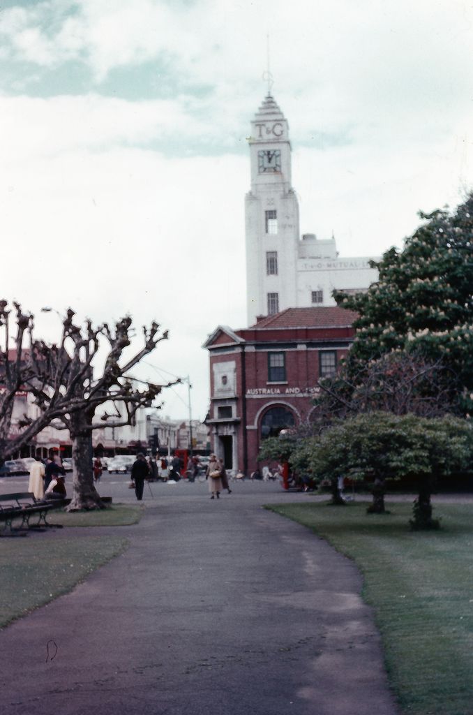 Photo taken by Terry Finnerty, photographer. Street level view shows intersection Broadway Avenue and The Square. Opposite The Square is Australia and New Zealand Bank Limited. On Broadway Avenue, the T&G Clock Tower dominates.