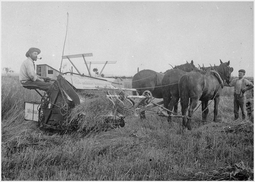The crop being harvested appears to be wheat. “Bill Read, Farmer” is written on the back of photograph