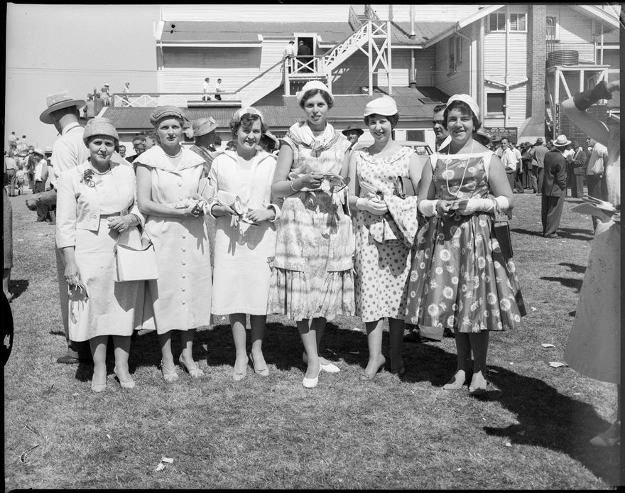 This image was taken for a story that ran in The Manawatu Evening Standard on 24 November 1958: "A hot summer's day prevailed for the second day of the Feilding Jockey Club's Sprint Meeting on Saturday, giving a good opportunity for the women to show their latest fashions. Some of those who were present are, from left to right: Mrs. S. Jones, Mrs. G. Lambert, Misses L. Jones, J. Rutherford, A. Shalders and P. Barker, all of whom are from Feilding."