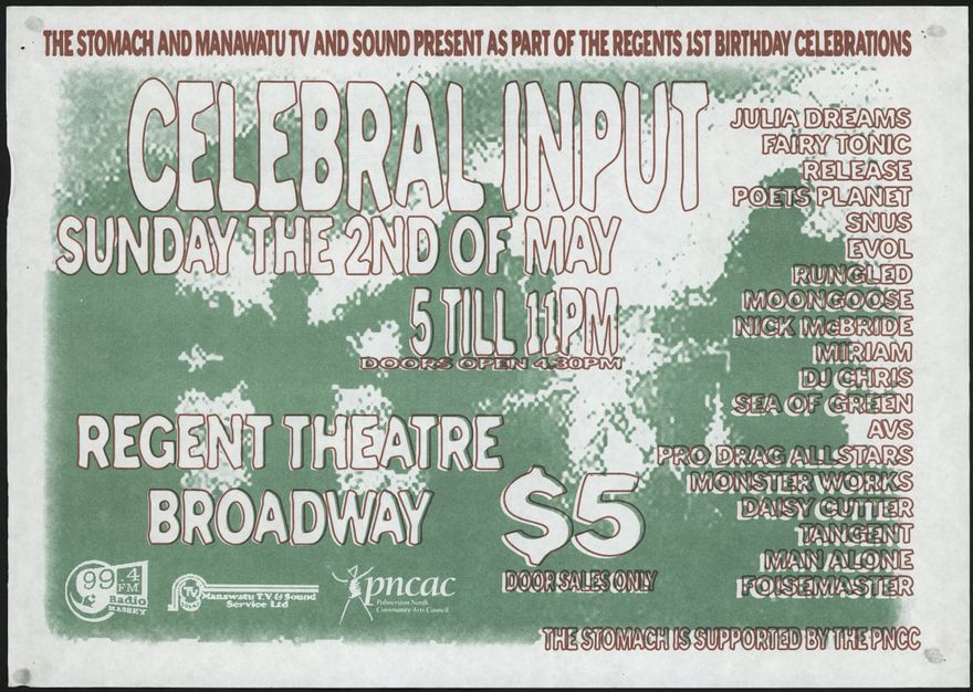 The Stomach and Manawatu TV and Sound present as part of the Regent's 1st birthday celebrations. Celebral Input. Sunday the 2nd of May 5 till 11pm. Doors open at 4.30pm. Regent Theatre Broadway. $5 door sales only. Julia Dreams, Fairy Tonic, Release, Poets Planet, Snus, Evol, Rungled, Moongoose, Nick McBride, Miriam, DJ Chris, Sea of Green, AVS, Pro Drag Allstars, Monster Works, Daisy Cutter, Tangent, Man Alone, Foisemaster. 99.4 FM Radio Massey. The Stomach is supported by PNCC.