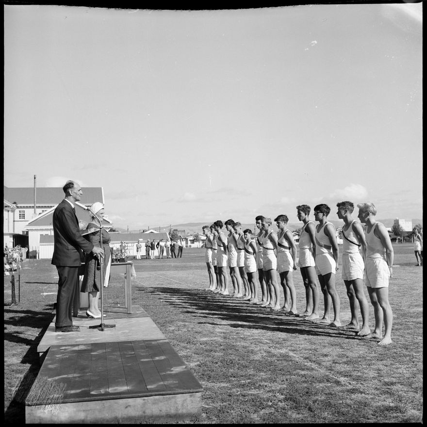 This image was taken for a story that ran in The Manawatu Evening Standard on 15th March, 1963. "Trophies were presented to 13 champions at the Palmerston North Boys' High School athletic sports yesterday. Mrs P.G Evans presented the trophies to the boys."