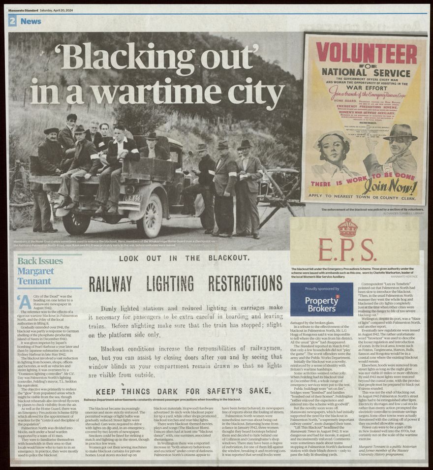 Local historians weekly "Back Issues" article in the Manawatū Standard. From 1941, lighting restrictions were put in place in Palmerston North and elsewhere. Under the Emergency Precautions Scheme, street lights, shops, factories, offices, vehicles and households were affected. The objective was to reduce the glow from populated areas which might be visible from sea and the air by enemy forces. By mid-1943, lighting restrictions for safety reasons were lifted beyond coastal zones. Street lighting restrictions continued for some time, due to electricity shortages and low coal stocks.