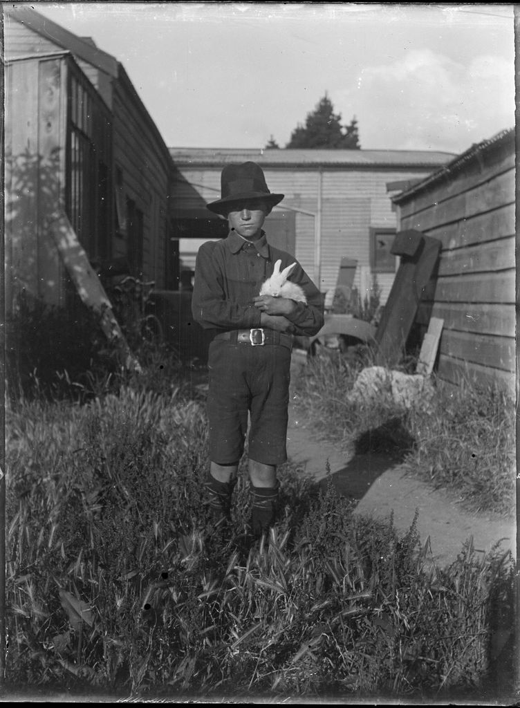 This image is believed to have been taken by Palmerston North Engineer Edwin Daniel Berry or his son Frank. It depicts a young boy who appears in several images in the Berry Family Collection, and is believed to be youngest son Zenas Jefferson Berry (b.1906). He is holding a pet rabbit and is likely at the back of the original Berry Engineering premises in Main Street.