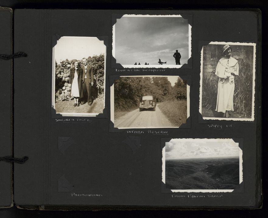 This photograph album depicts the Creighton Family of 5 Donnington Street, Palmerston North. It shows a range of different locations around Palmerston North and the surrounding area, ranging from 1940 to around 1943. The woman in most of the pictures (unless otherwise specified) is Emma Curling Creighton (aka Goldie, Bubs, Curling and Spiffy), while the man is Melvyn J Creighton. They married 19 July 1941 and had Robyn Curling Creighton 29 December 1942 and Lynn Melwynn Creighton 20 October 1948.