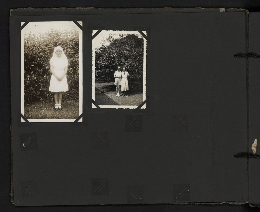 This photograph album depicts the Creighton Family of 5 Donnington Street, Palmerston North. It shows a range of different locations around Palmerston North and the surrounding area, ranging from 1940 to around 1943. The woman in most of the pictures (unless otherwise specified) is Emma Curling Creighton (aka Goldie, Bubs, Curling and Spiffy), while the man is Melvyn J Creighton. They married 19 July 1941 and had Robyn Curling Creighton 29 December 1942 and Lynn Melwynn Creighton 20 October 1948.