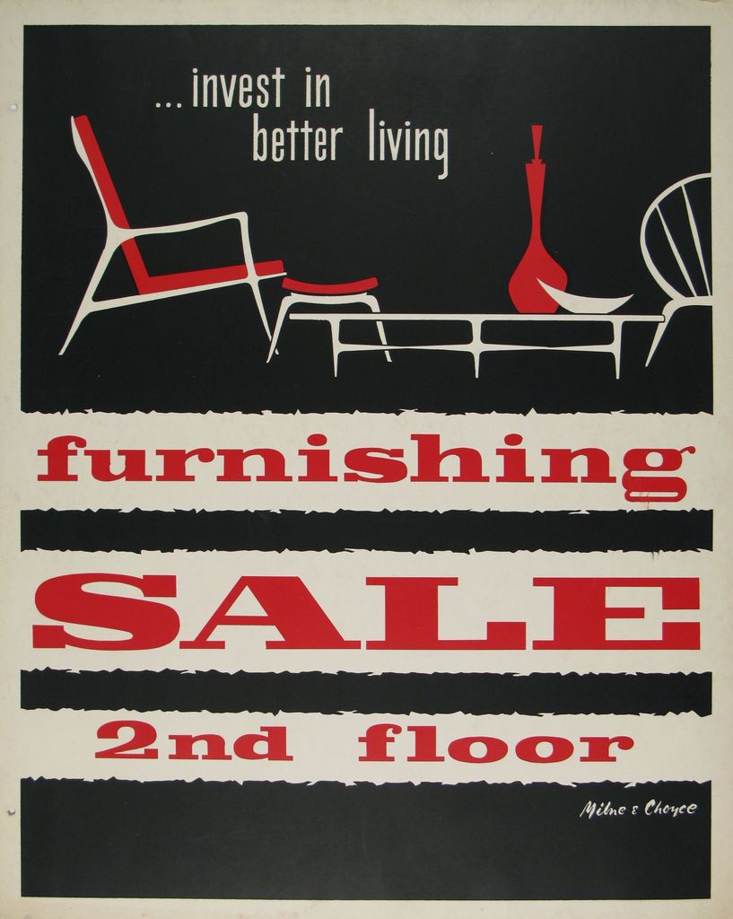 Poster advertising a Furnishing Sale, created by Allan Smith while working in the Display Department of Milne and Choyce. He was first employed by the C M Ross department store in 1959, which was then bought out by Milne and Choyce. He rose to become Display Manager. Milne and Choyce operated in The Square, Palmerston North 1959-1966. Black, white and red on board, for display in the store