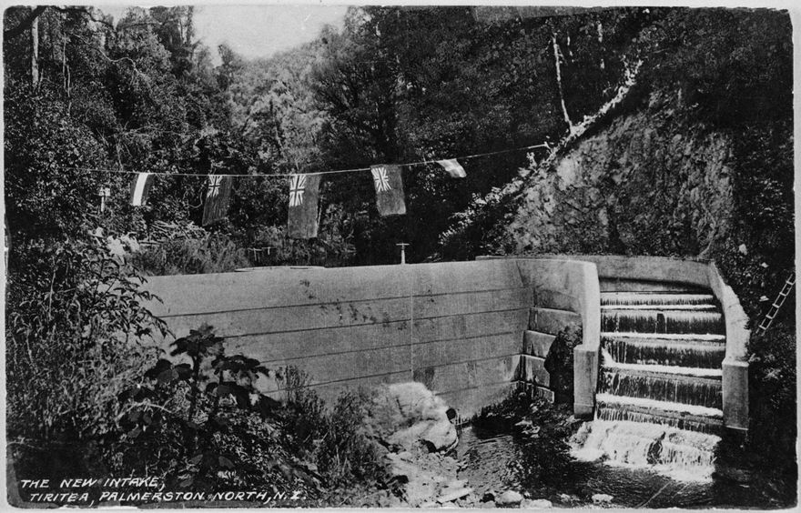 The second Turitea Dam was built in 1906-1907 and officially opened 2 March 1909. The dam was was raised to 50 feet in 1912. This new enlarged structured was officially opened February 17 1913 and remained in use until 1957 when a 100 ft high dam was constructed.