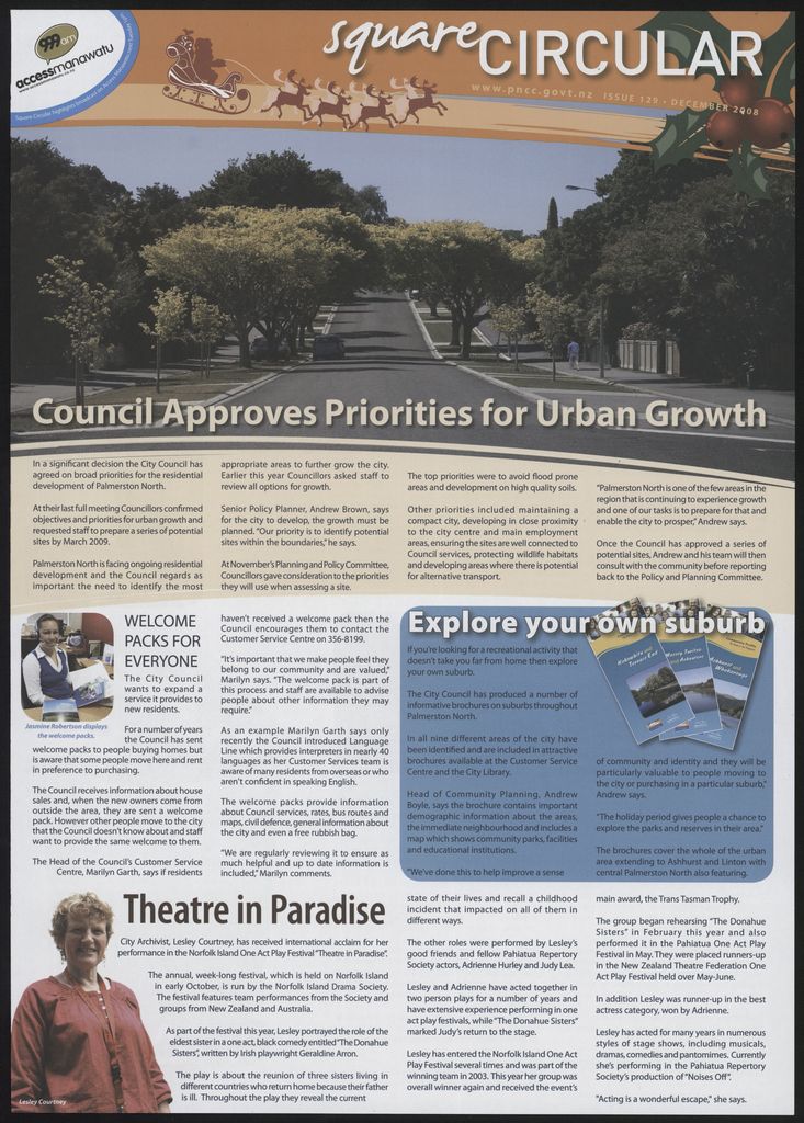 The Square Circular was Palmerston North City Council's monthly community publication, informing Palmerstonians of PNCC initiatives, activites, and events. This month's issue includes: urban development, welcome packs, suburbs brochures, district plan, civil defence and emergency planning, resealing roads programme, recycling bins at events, bus shelters, Memorial Park, Kahuterawa outdoor recreation plan, The Stomach, Christmas in The Square, New year's eve in The Square, Te Manawa exhibition, librarian Jay Robinson, Lesley Courtney.