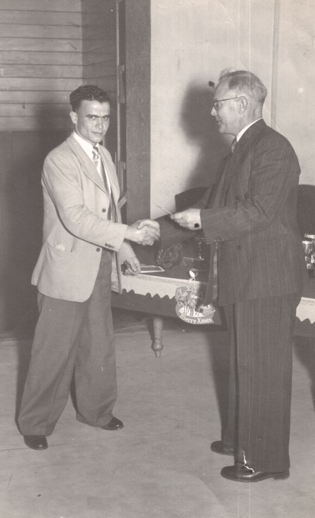 Minas Nicoletatos, also known as Mark Nicholls (left) being presented with a certificate for his wrestling with the Kiwi Sport Club, Palmerston North. Mina Nicoletatos was the featherweight wrestling champion for the Kiwi Sport Club Inc. in 1949 and 1951. He was runner-up in 1948. During his time at Kiwi Sport club he used the name Mark Nicholls and this is the name printed on his certificates.