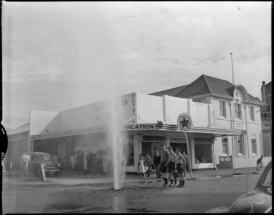 This image was taken for a story that ran in The Manawatu Evening Standard on 04 November 1958: "No thermal activity produced this convincing geyser, which attracted the attention of passers-by in King Street yesterday, but a burst water main was responsible for the plume of spray rising from the roadway."