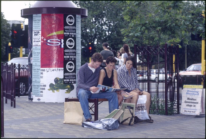 Three people read a magazine in The Square. This slide is from a series that was possibly taken for publicity purposes. Based on other images in the set, this image appears to have been taken in the mid-1990s.