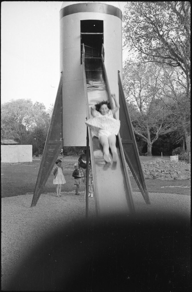 A girl coming down a 'rocket' slide at the Esplanade Gardens. Believed to be the photographer's daughter, Joan MacKay.