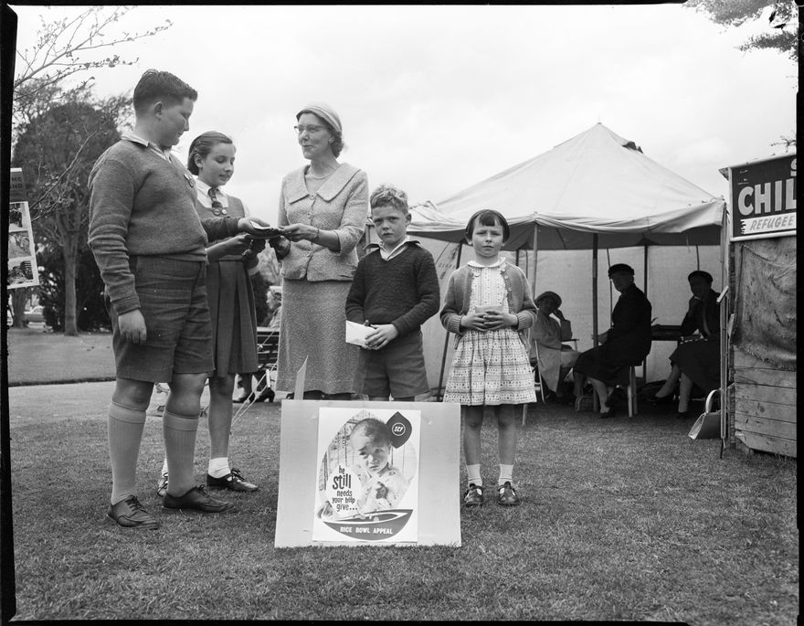 This image was taken for a story that ran in The Manawatu Evening Standard on 08 October 1960 "With the sale of tickets and badges for membership to the Save the Children Fund, one group of children collected over £40 for the Rice Bowl Appeal this week. The children were photographed presenting the money to the president of the Save the Children Fund (Mrs. T.L. Fancourt) yesterday. They are (from the left): J. Dean, A. MacKillop, Mrs. Fancourt, L. Wilson and S. Weir."