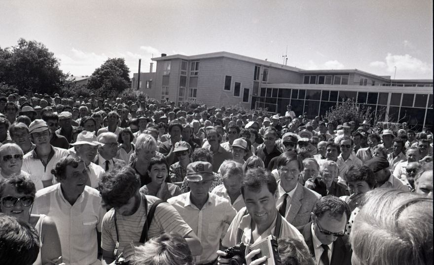 This series of images was taken for a story that ran in on the front page of The Manawatu Evening Standard on 10 February, 1987. The story pertains to the mortgagee auction of a farm owned by Paul Geurtjens of Bulls. Up to 700 protesters attended the auction at Harcourts real estate on Fitzherbert Avenue. Auction proceedings were interrupted by protesters placing false bids and drowning out proceedings. The property was not sold as it didn’t raise a bid. The images of Longburn workers protesting appear on the same roll of film, however it is unclear if theese are from the same event.
