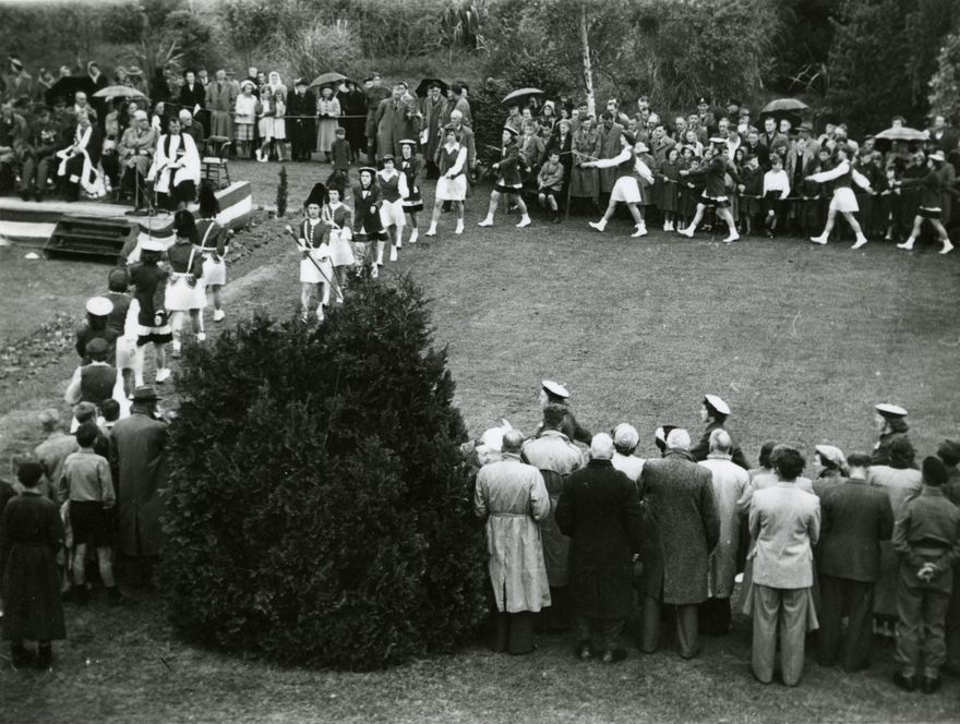 Marching girls perform for the crowd attending the unveiling. The obelisk at Fitzroy Park, as it was then called, was unveiled in this ceremony by Major-General Sir Howard Kippenberger. Marching girls performed as part of the occasion. Later, in 1954, the park was dedicated and renamed Memorial Park. The obelisk, in a state of disrepair, was removed in 1983 and now only the gates into the park remain as the memorial.