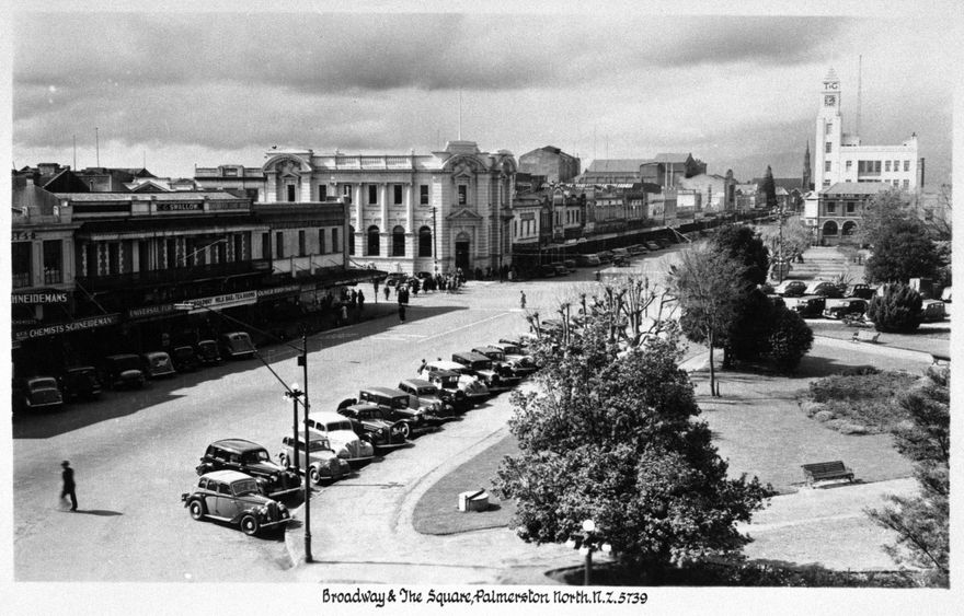 This photograph shows the intersection between Rangitikei Street and The Square. Beyond that is the intersection between Broadway Avenue and The Square. The building with a clock tower on the far right is the Australasian Temperance and General Mutual Life Assurance Society Ltd (T&G) building in Palmerston North. It was designed by A and K Henderson in the distinctive 'house' style developed by the firm and constructed in 1938. The ornate building is the Bank of New Zealand (BNZ). This building was constructed in 1915, to replace the former BNZ on the corner of Fitzherbert Avenue and The Square. It was demolished to make way for a new BNZ in 1988. It is now occupied by retail stores.