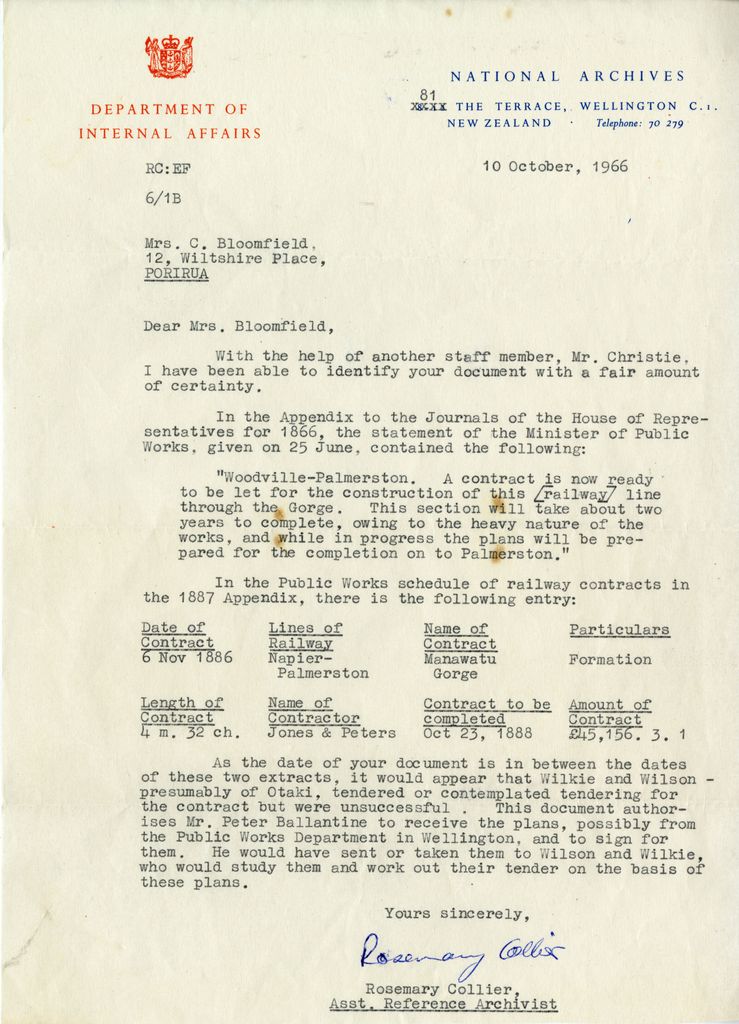Correspodence between the National Archives and a member of the public regarding the tendering for contracts to construct railway lines through the Manawatū Gorge during 1886.