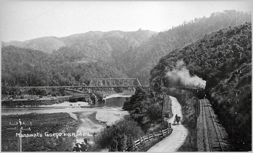The road from Woodville enters the Gorge just after the Ballance Bridge over the Manawatu River, shown on the left. The steam train departs a tunnel on the railway track through to Napier, opened in 1891.