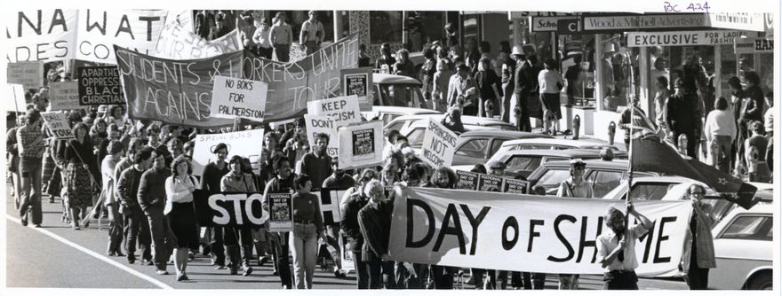 This image was taken for a story that ran in The Manawatu Evening Standard on 22 July 1981, with the caption: "Half mast flag marks 'shame' day: Palmerston North's anti-tour protestors marked New Zealand's 'National Day of Shame' with a peaceful march through the central City." The 'Day of Shame' march was the largest of several protest events before and after the Springbok Rubgy team played Manawatū in Palmerston North in 1 August 1981. The March moved from St Patrick's cathedral, down Broadway Avenue, circled the Square, ending in the 'Lion's Den' quadrant. 500 demonstrators began the march but the numbers may have swelled to 1000 by its end. The protesters were occasionally heckled by pro-tour members of the public. March chants included "Don't scrum with racist scum", and "We don't want your racist tour".