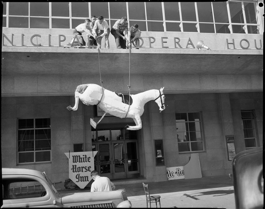 This image was taken for a story that ran in The Manawatu Evening Standard on 11 April, 1959. "A life size model of a white horse was placed in position over the Opera House this morning. The model was brought to the city from Hastings by members of the Palmerston North Amateur Operatic and Dramatic Society as part of their advertising campaign for "White Horse Inn". The photograph shows five men hoisting the animal into position on the verandah above the main doors of the theatre."
