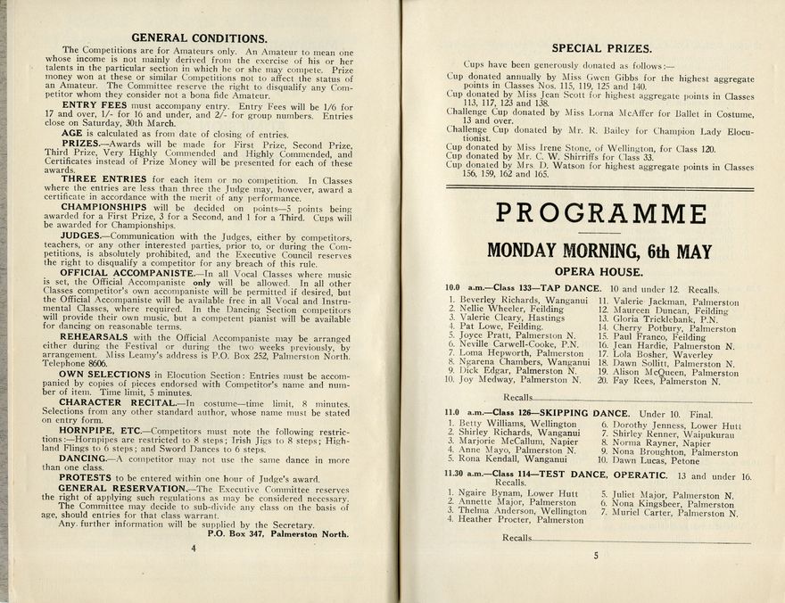 This is the programme for the Seventeenth Annual Festival of the Manawatū Competitions Society, which was held in the Opera House and Empire Hall between 6 May and 11 May 1940. The competition categories included elocution (speech and drama), dance and music (both vocal and instrumental). Most entrants were children or young people.