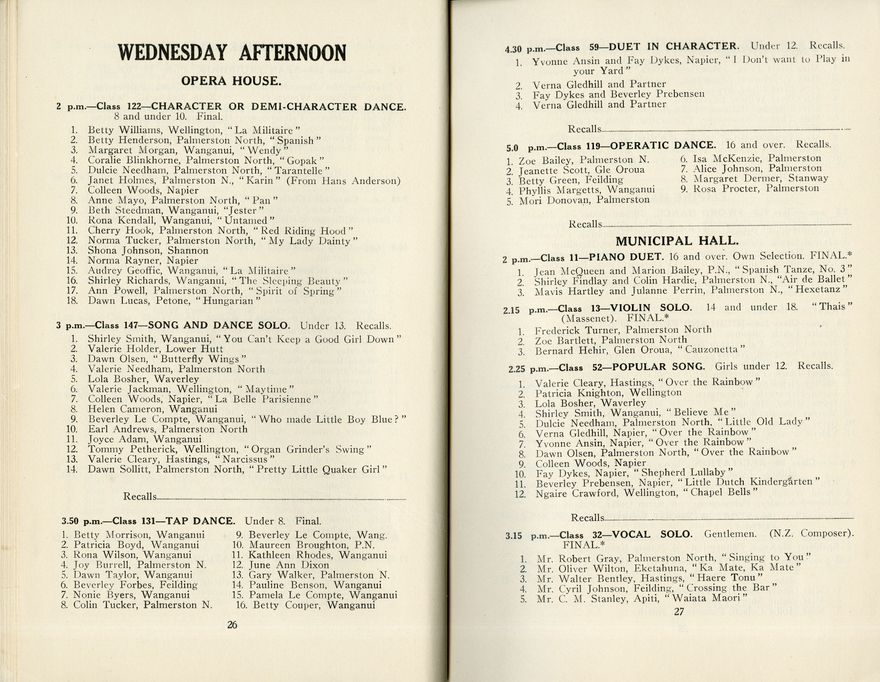 This is the programme for the Seventeenth Annual Festival of the Manawatū Competitions Society, which was held in the Opera House and Empire Hall between 6 May and 11 May 1940. The competition categories included elocution (speech and drama), dance and music (both vocal and instrumental). Most entrants were children or young people.