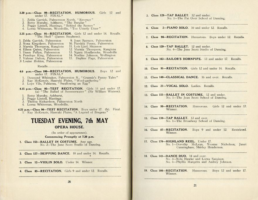 This is the programme for the Seventeenth Annual Festival of the Manawatū Competitions Society, which was held in the Opera House and Empire Hall between 6 May and 11 May 1940. The competition categories included elocution (speech and drama), dance and music (both vocal and instrumental). Most entrants were children or young people.