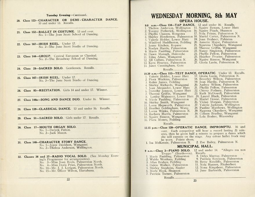 This is the programme for the Seventeenth Annual Festival of the Manawatū Competitions Society, which was held in the Opera House and Empire Hall between 6 May and 11 May 1940. The competition categories included elocution (speech and drama), dance and music (both vocal and instrumental). Most entrants were children or young people.