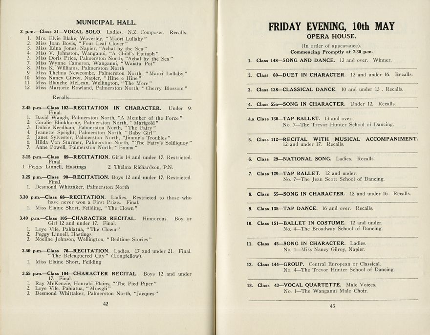 This is the programme for the Seventeenth Annual Festival of the Manawatū Competitions Society, which was held in the Opera House and Empire Hall between 6 May and 11 May 1940. The competition categories included elocution (speech and drama), dance and music (both vocal and instrumental). Most entrants were children or young people.