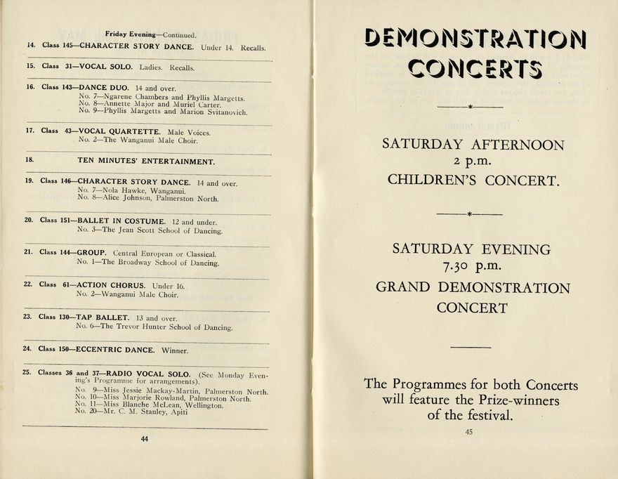 This is the programme for the Seventeenth Annual Festival of the Manawatū Competitions Society, which was held in the Opera House and Empire Hall between 6 May and 11 May 1940. The competition categories included elocution (speech and drama), dance and music (both vocal and instrumental). Most entrants were children or young people.