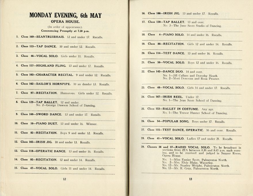 This is the programme for the Seventeenth Annual Festival of the Manawatū Competitions Society, which was held in the Opera House and Empire Hall between 6 May and 11 May 1940. The competition categories included elocution (speech and drama), dance and music (both vocal and instrumental). Most entrants were children or young people.