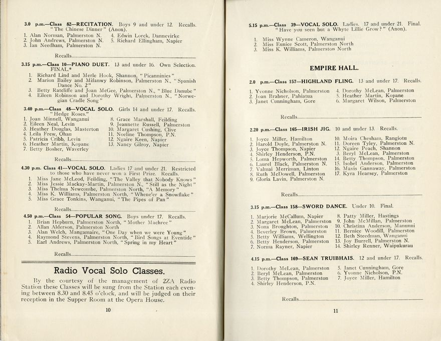 - This is the programme for the Seventeenth Annual Festival of the Manawatū Competitions Society, which was held in the Opera House and Empire Hall between 6 May and 11 May 1940. The competition categories included elocution (speech and drama), dance and music (both vocal and instrumental). Most entrants were children or young people.