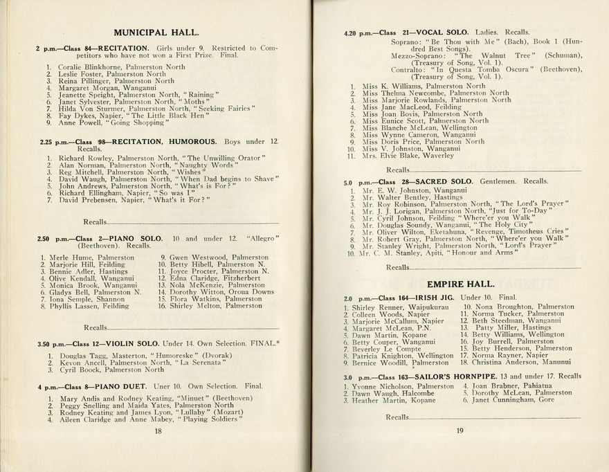 This is the programme for the Seventeenth Annual Festival of the Manawatū Competitions Society, which was held in the Opera House and Empire Hall between 6 May and 11 May 1940. The competition categories included elocution (speech and drama), dance and music (both vocal and instrumental). Most entrants were children or young people.