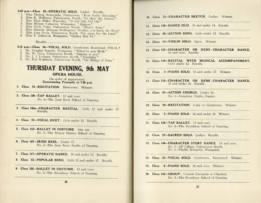 This is the programme for the Seventeenth Annual Festival of the Manawatū Competitions Society, which was held in the Opera House and Empire Hall between 6 May and 11 May 1940. The competition categories included elocution (speech and drama), dance and music (both vocal and instrumental). Most entrants were children or young people.