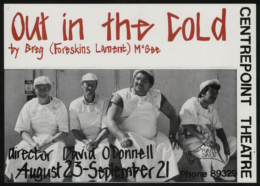 "Out in the Cold by Greg (Foreskins Lament) McGee. Director David O'Donnell. August 23 - September 21. Music by Purple Siren. Centrepoint Theatre. Phone 89329." Part of a collection of posters that were displayed in the Public Library in the 1970s - 1980s.