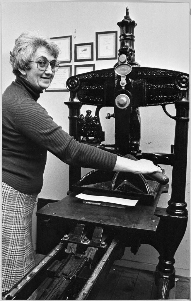 Mina McKenzie, Museum Director, is demonstrating an Albion Flatbed printing press used at the printery. The printery is no longer in operation.