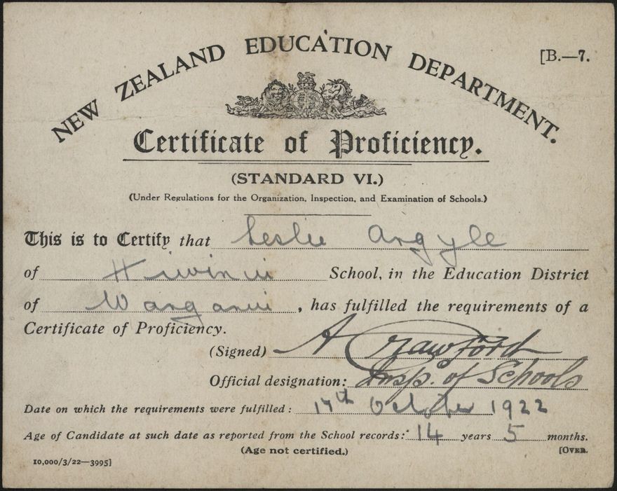 Certificate that certifies that Leslie Argyle fulfilled the requirements of a Certificate of Proficiency in October 1922. He was then 14 and half years old and attended Hiwinui School in the Manawatū.