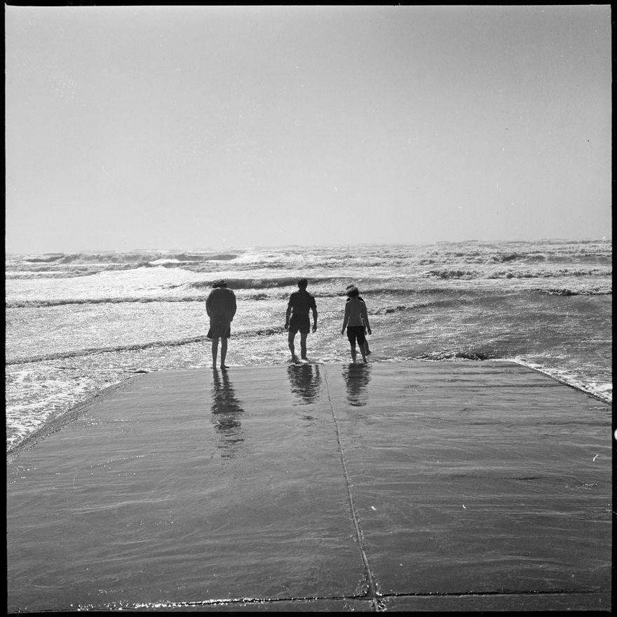 This image was taken for a story that ran in The Manawatu Evening Standard on 30th December 1965 "Although the only people at Foxton Beach yesterday afternoon were these four who braved gale force winds and walked to the end of the concrete ramp leading onto the beach to watch the huge waves pounding in."