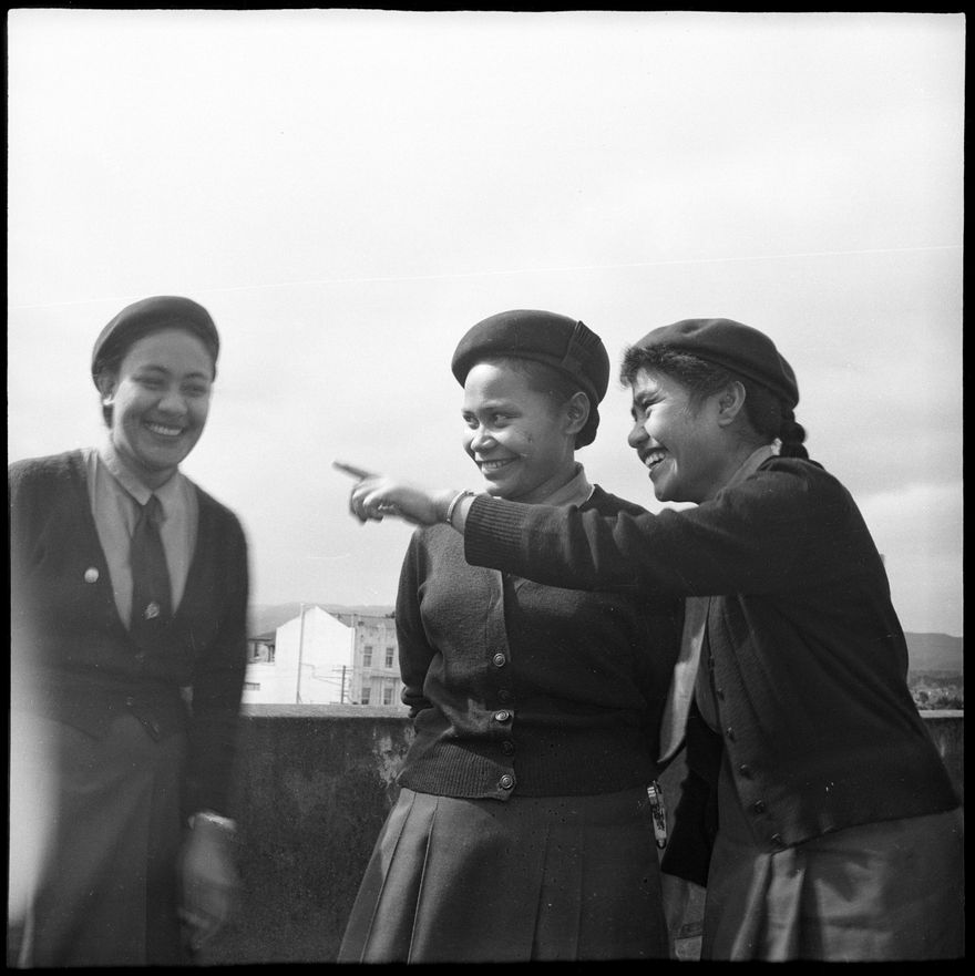 [Photograph of three girl guides, posing on top of a multi storey building, pointing out the sites.]