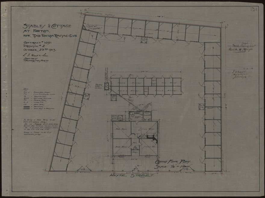 These plans for stables, feed-boxes and a cottage were designed by L. G. West & Son for the Foxton Racing Club. The Danish-born architect Ludolph Georg West (1846-1919) established an architectural practice in Palmerston North in about 1880. In 1912 he formed a partnership with his son, Ernest Vilhem West, who continued the business after his father's death.