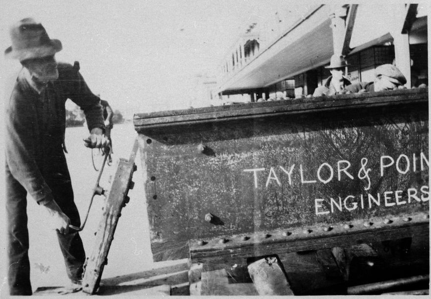 A new 3 storey, C M Ross department store was built to replace a number of buildings, in 1927-1928. This beam appears to be one of the main supporting beams in the building. The beam is probably about to the positioned across the side of the building facing The Square. Taylor and Pointon Engineering, which was located at 89 Rangitikei Street, were the firm involved in construction of the building. See 2008n_bc296_cmross_1603 for a view of the completed building.