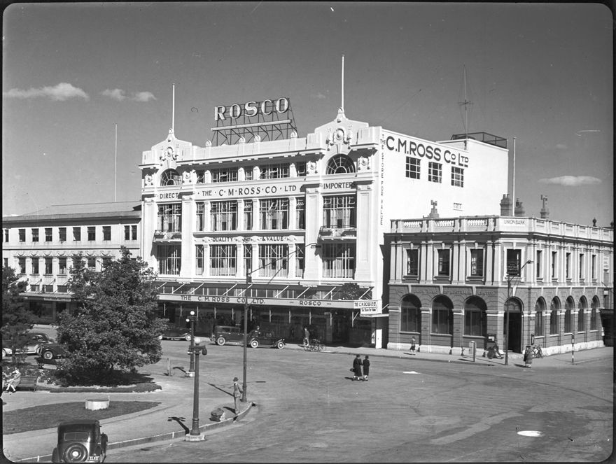 The C M Ross Co. Ltd was one of the foremost department stores in Palmerston North. The business was established by Charles Ross in 1883, and this building was constructed in 1927-1928, replacing a number of buildings on The Square. It linked through to Coleman Mall and George Street buildings. The business was sold in 1959 to Milne and Choyce and later was bought out by the DIC, then Arthur Barnetts. It was sold to the PNCC and after extensive renovation opened as the Palmerston North City Library in 1996.