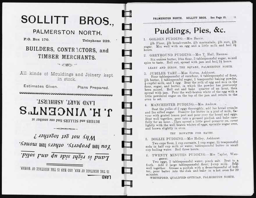 A reproduction of Our Own Cookery Book compiled by Mrs J. West for the Ashhurst Town Band Bazaar. The cook book features community submitted recipes (including the names of contributors) and includes many advertisements of local area businesses.