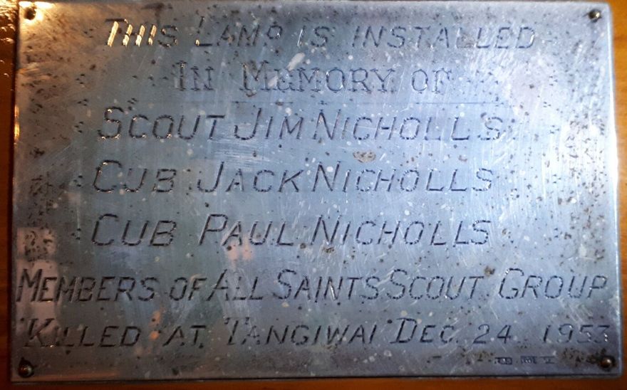On December 24 1953, the five members of the Nicholls family died at Tangiwai Bridge in New Zealand's worst rail disaster. This plaque commemorates the three sons that died. It is situated in "Scouts and Guides Corner" of All Saints Church.