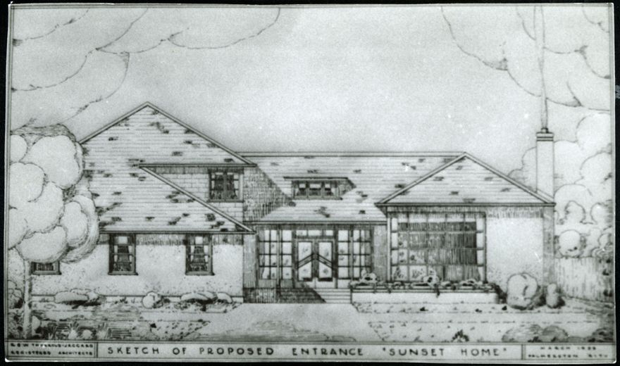 "Eventide" - sketch of entrace. See the Thorrold-Jaggard papers, volume VI (July 1955-Dec 1957) for further plans of the Brightwater Home, volume V (Oct 1951 - July 1955), six pages from the end for a descriptive article; Volume VII (Jane 1958 - Mar 1960), P 3.