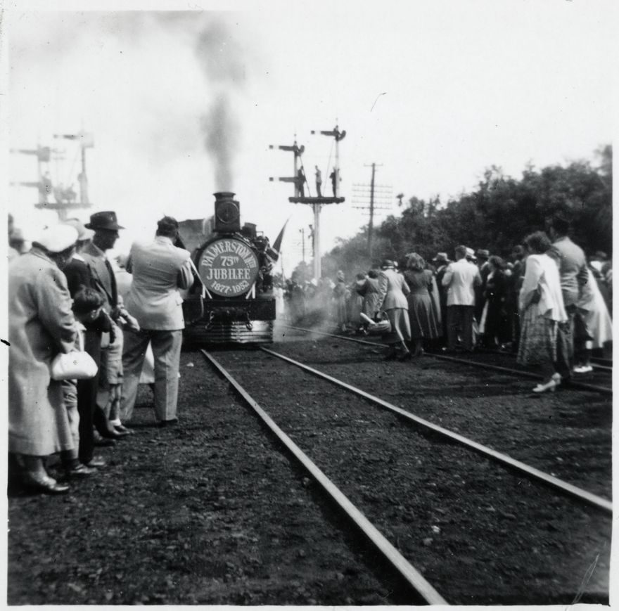 Palmerston North held its 75th Jubilee Celebrations during the week of 15th March 1952. This locomotive was decked with flags and ribbons to give a special trip to commemorate the occasion. Crowds of onlookers surround the train.