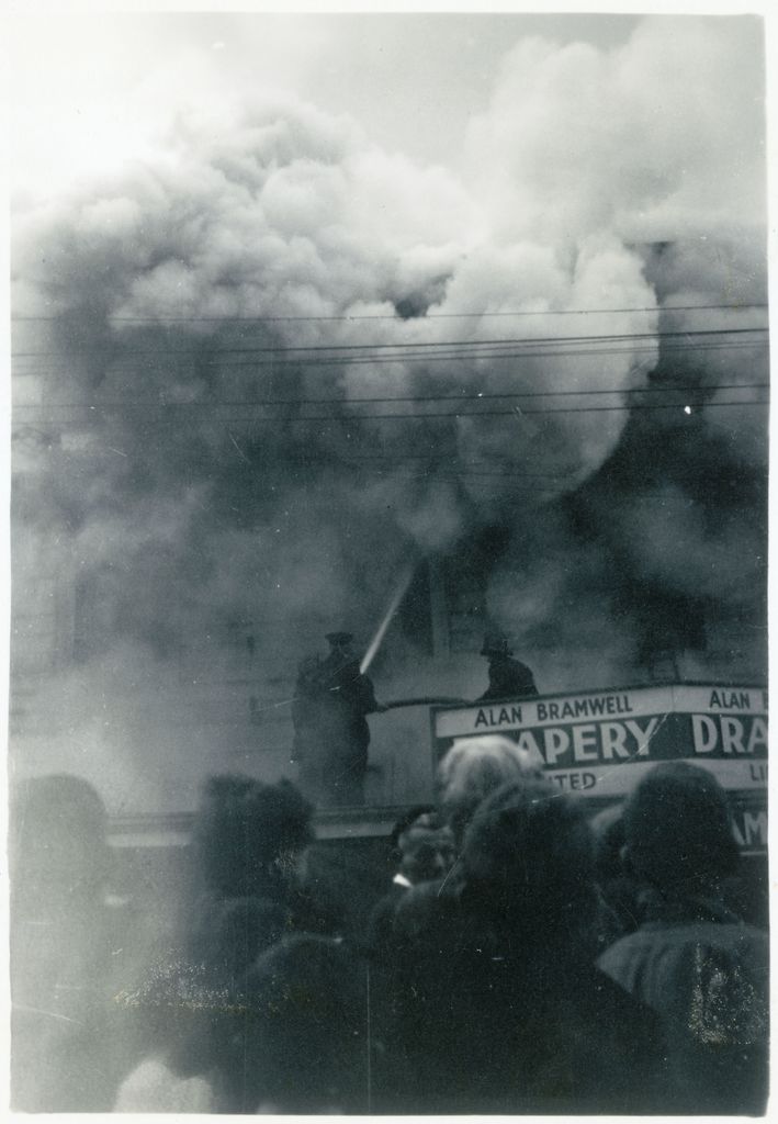 This photograph shows smoke billowing from the front of the building that housed the Alan Bramwell Drapery. It is unknown where this building is, but based on photographs that are in the same collection it is estimated the fire happened in the 1950s.