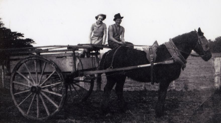A horse and gig in Rongotea. The woman may be Lorna Parker. Her parents, John and Sarah had a dairy farm on Banks Line, Rongotea.