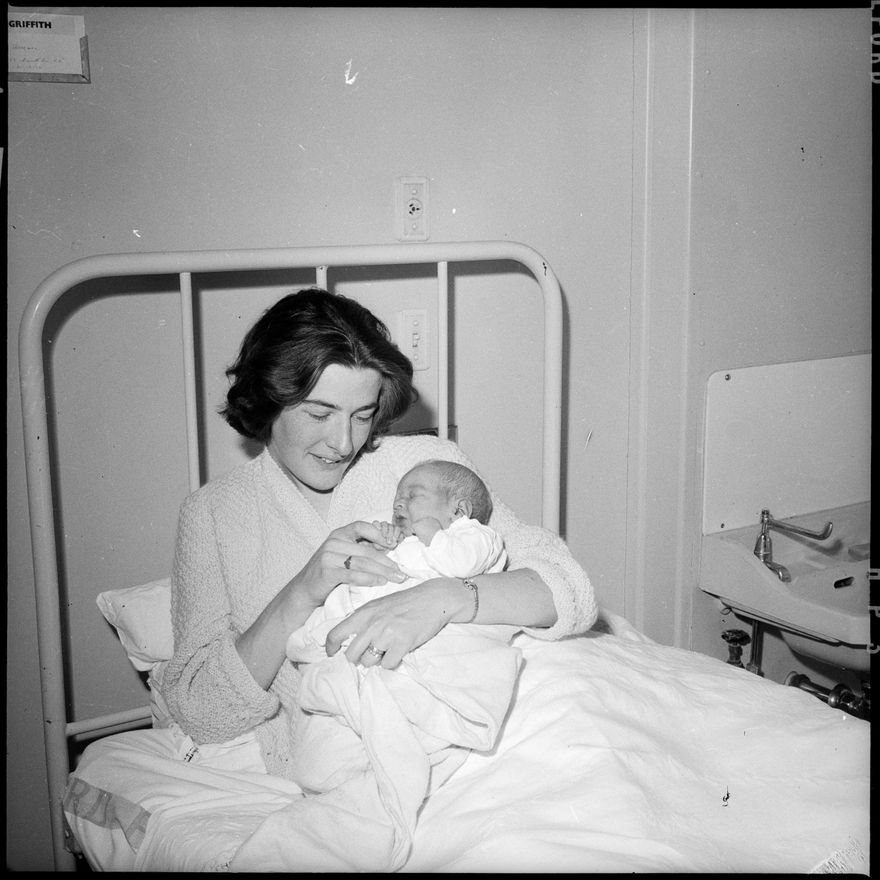 This image was not published in The Manawatu Evening Standard taken on 2 January, 1964. "Four babies delighted their parents by arriving on New Year's Day at the Palmerston North Maternity Home. The son born to Mrs H. T. Clark made his entry into the world at one minute past midnight. Top left is Mrs H. T. Clark with her son: top right is Mrs B. Kenna with her daughter: bottom left is Mrs M. Sherman with her son: and bottom right is Mrs A. H. Grant with her son." This image is Mrs Sherman and her son. Another image of the two was published on 2 January, 1964. See also: 2017N_2017-20_018260, 2017N_2017-20_018261, 2017N_2017-20_018262