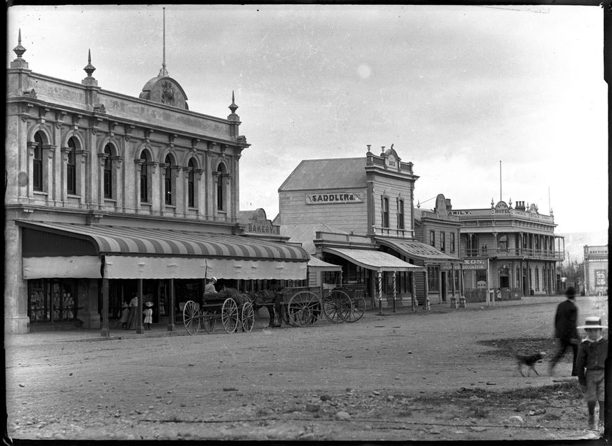 Compare with 2014N_Sq20_008572, taken in 1893. Possibly taken just before the construction of the two storey wooden building which housed Jubal Flemming's Hairdressing Salon (see 2014N_Sq20_008572). Buildings, from left: The Manawatu Farmer's Co-operative Association (missing its sign). The site was previously occupied by the Ready Money Store (see Sq 62); Pioneer Bakery; Soloman Abraham's store and pawnshop (he was mayor of Palmerton North from 1887-1889); T Wray Saddler (established 1875); W Nixon, painter and decorator; Brodie Whiting and Co (in Sq 20 Blue Paperhabing Warehouse); Club Hotel (situated on Church Street)